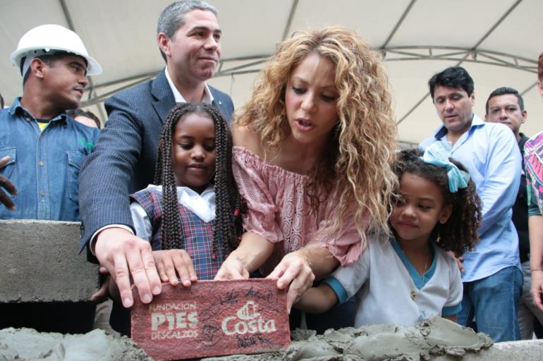 Shakira, junto Dario Rustico, Director de Costa Cruceros en Sudamérica colocaron este viernes, el primer ladrillo para la construcción de dos colegios en el norte de Colombia que beneficiarán a más de 2,000 estudiantes de escasos recursos.
