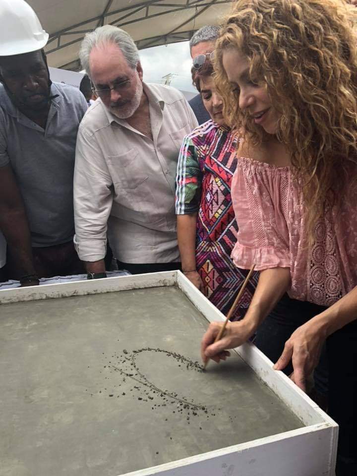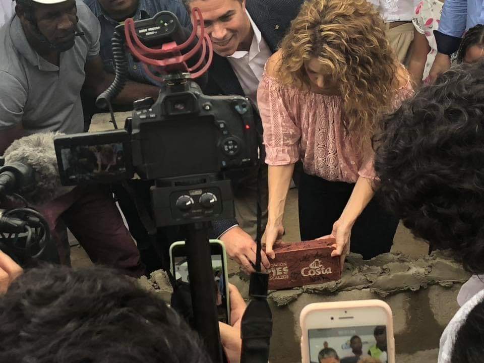Shakira, junto Dario Rustico, Director de Costa Cruceros en Sudamérica colocaron este viernes, el primer ladrillo para la construcción de dos colegios en el norte de Colombia que beneficiarán a más de 2,000 estudiantes de escasos recursos.