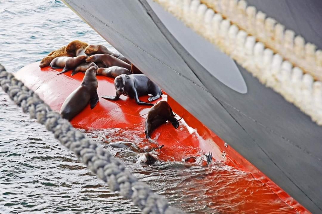 Los 1200 pasajeros que descendieron en este destino en busca de descubrir nuevos paisajes , fueron sorprendidos de una manera muy especial. Una manada de lobos marinos se acercaron a la embarcación para reposar nada mas ni nada menos que en el bulbo de proa de la nave.
