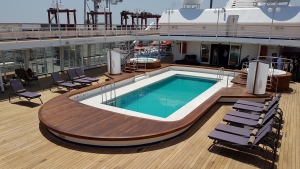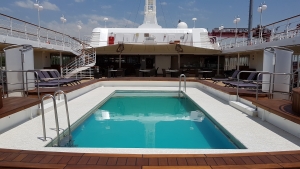En su pasaje por la Antártida, el Silver Cloud transitaba por los canales acompañado por las baja temperatura que asecha a dicha península, un intenso frió y la nieve cuando de manera sorpresiva toda la piscina central y sus alrededores se vió cubierta por una alta y abundante capa de nieve como se observa en la foto. Tamaña tarea tuvo el personal de la tripulación de la embarcación para retirar la nieve lo mas rápido posible de estas áreas publicas, no logrando el objetivo tan pronto como lo esperaban.