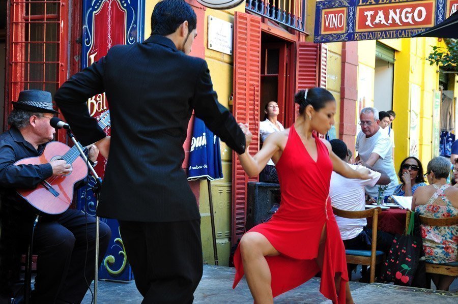 Buenos Aires es la capital mundial del Tango, esa danza sensual y nostálgica que se baila en estrecho contacto con la pareja y que tuvo entre sus más renombrados intérpretes a Carlos Gardel y Astor Piazzolla. No faltan las casas de tango con espectáculos para turistas, las milongas (lugares para bailar tango) ni las escuelas donde ver o practicar este sugestivo baile. Las principales tanguerías de Buenos Aires ofrecen a los turistas espectáculos de tango con todo su glamour. Son lugares de alto nivel y de precios acorde. En muchas casas también es posible cenar antes del show o disfrutarlo con alguna bebida. Los espectáculos son una sucesión de varios números artísticos, que incluyen grupos instrumentales, cantantes y parejas de bailarines. Algunos de los lugares que ofrecen esta posibilidad de espectáculos nocturnos son: Café de los Angelitos, Señor Tango, Bar Sur, Café Tortoni, entre otros. San Telmo: San Telmo es una de las zonas mejor conservadas dentro de la siempre cambiante Buenos Aires, y se caracteriza por sus caserones coloniales y sus calles, muchas de las cuales aún están empedradas con adoquines. Entre las atracciones que se pueden visitar en este barrio, se encuentran algunas iglesias antiguas como la de San Pedro Telmo, museos, tiendas de antigüedades y de diseño y una feria de antigüedades y artesanías, la Feria de San Telmo que toma lugar en la plaza principal, Plaza Dorrego y en la Calle Defensa cada domingo. Además de los puestos de artesanías, hay también artistas callejeros, músicos, bailarines, titiriteros, magos y estatuas vivientes en la calle Defensa durante la feria.