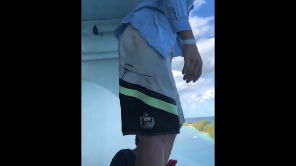 El conocido y popular Blog de deportes y cultura Barstool Sports ha publicado un video de un joven saltando de un barco de cruceros mientras la embarcación navegaba cerca del puerto de Nassau en Bahamas. El video fué filmado por unos de sus amigos y muestra al joven trepando en la parte superior de la baranda de su camarote saltando del barco desde unos 22 metros de altura al mar.