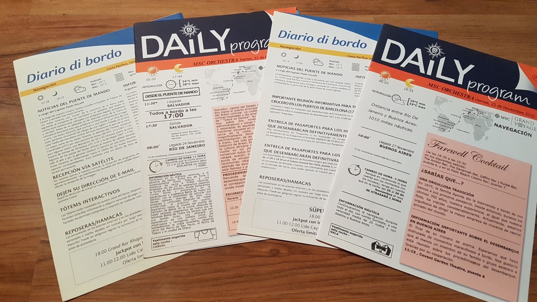 Este documento físico de gran utilidad, dotado de valiosa información, que se te entregará directamente en tu cabina con una jornada de antelación. Cuando los recibas en tu propio camarote, generalmente, su contenido estará escrito en el idioma de la ciudad o país de la naviera. Sin embargo, existe la posibilidad de que consultes y recibas este papel en español, inglés, francés o portugués.