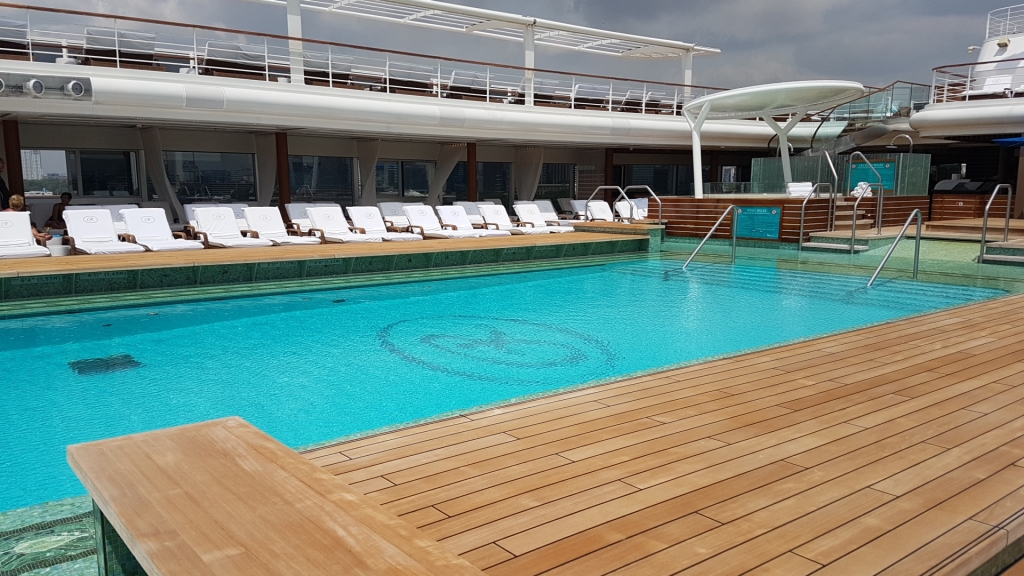 El oasis de la cubierta 11, inspirado en un club de playa con su piscina boutique, proporciona un ambiente intimo para relajarse, nadar, y disfrutar de las mejores vistas durante la navegación o en los puertos de destino .