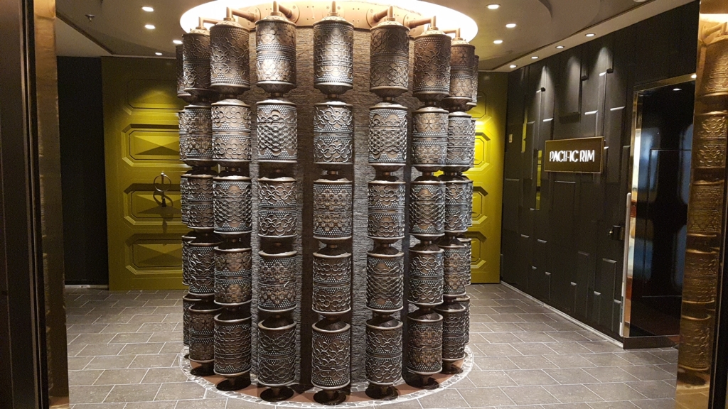 La pieza de arte más monumental del Seven Seas Explorer es la rueda de Oración Tibetana de dos toneladas de bronce fundido en la entrada al Pacific Rim, el restaurante de fusión asiática. La pieza costó 500,000 dolares, pero a pesar del valor de la misma, eso no es lo que la convierte en un lujo sino que es la única de su tipo, hecha totalmente a mano para lograr una auténtica obra de arte. Es un lujo porque es la única en el mundo que no se encontrará en ningún otro lado.