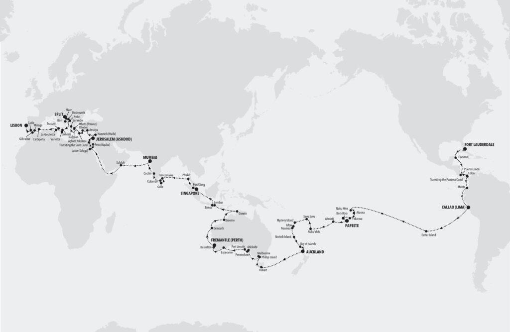 Después de una experiencia de viaje seleccionada, que incluye traslados ejecutivos privados, vuelos en clase Business y un servicio exclusivo para conocer y saludar, los pasajeros de cruceros mundiales abordarán Silver Dawnen Fort Lauderdale el 6 de enero de 2026, viajando por América Central, antes de transitar por el Canal de Panamá hacia América del Sur. Le seguirán la Isla de Pascua, la Polinesia Francesa y el Pacífico Sur, lo que llevará a los invitados a Nueva Zelanda y una semicircunnavegación de Australia. Luego, los viajeros explorarán el sudeste asiático, cruzando la Bahía de Bengala hacia Sri Lanka, India y el Mar Rojo, antes de pasar por el Canal de Suez hacia el Mediterráneo. Se adentrarán en la historia y la cultura europeas antes de que el viaje concluya en Lisboa, Portugal, el 27 de mayo de 2026. Los puntos destacados incluirán: